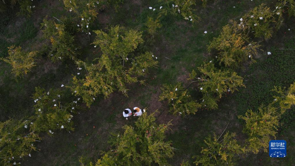 11月2日,在安徽省農業(yè)科學(xué)院園藝研究所石榴資源圃?xún)?,石榴?chuàng )新團隊負責人秦改花(左)與團隊成員賈波濤交流(無(wú)人機照片)。
