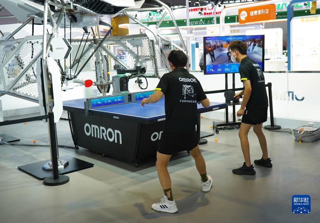 這是11月5日在第五屆進(jìn)博會(huì )技術(shù)裝備展區歐姆龍展臺拍攝的乒乓球教練機器人設備。