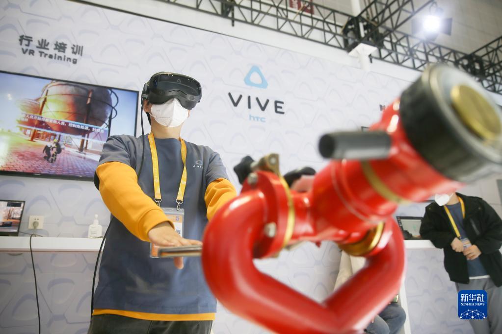 11月5日,工作人員在第五屆進(jìn)博會(huì )技術(shù)裝備展區展示VR行業(yè)培訓設備。