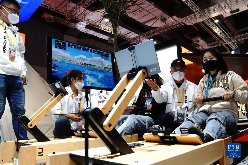11月5日,參觀(guān)者在第五屆進(jìn)博會(huì )的消費品展區體驗“劃船機”。