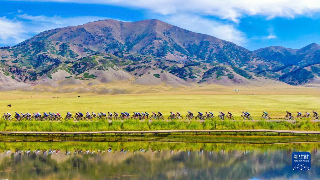 自行車(chē)賽選手在新疆賽里木湖國家濕地公園騎行(2022年7月26日攝,無(wú)人機照片)。