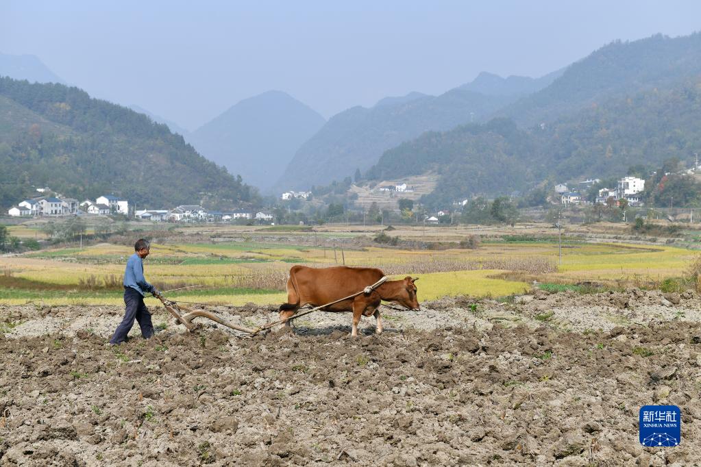 11月5日,湖北省宜昌市秭歸縣九畹溪鎮石柱村的農民在田間犁地,為冬播冬種做準備。