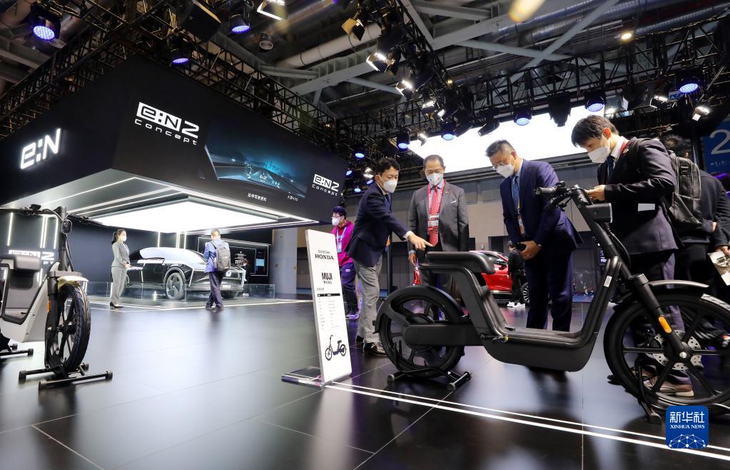 11月6日,參觀(guān)者在第五屆進(jìn)博會(huì )汽車(chē)展區日本本田汽車(chē)公司旗下新能源品牌展臺觀(guān)看電動(dòng)自行車(chē)展品。