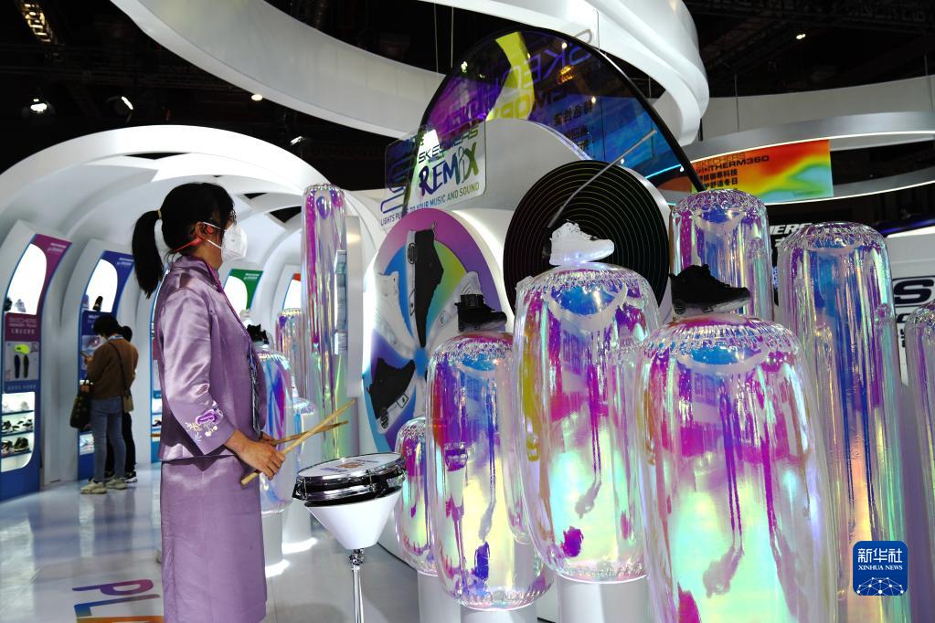 11月6日,參觀(guān)者在第五屆進(jìn)博會(huì )消費品展區體驗聲感閃燈鞋。