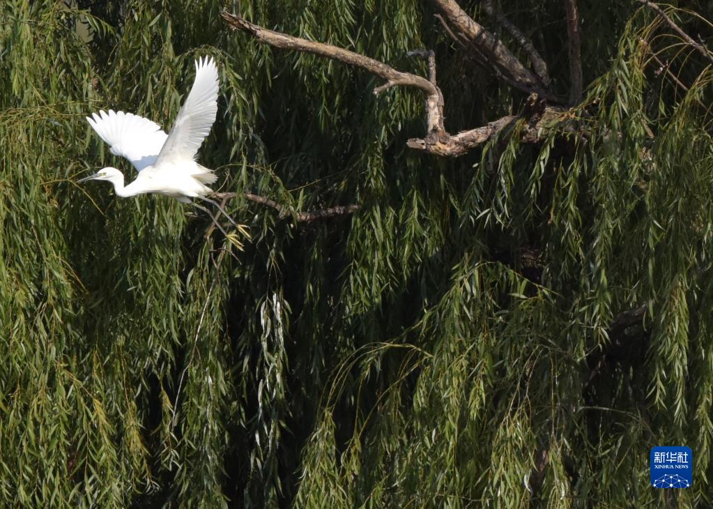 11月5日,一只白鷺在安徽巢湖半島國家濕地公園內飛翔。