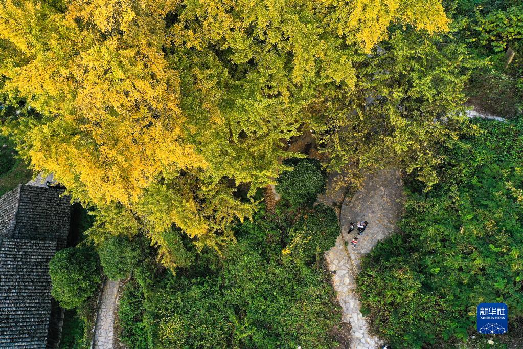 11月6日,游客在貴州省貴陽(yáng)市烏當區羊昌鎮黃連村的古銀杏樹(shù)下游覽(無(wú)人機照片)。