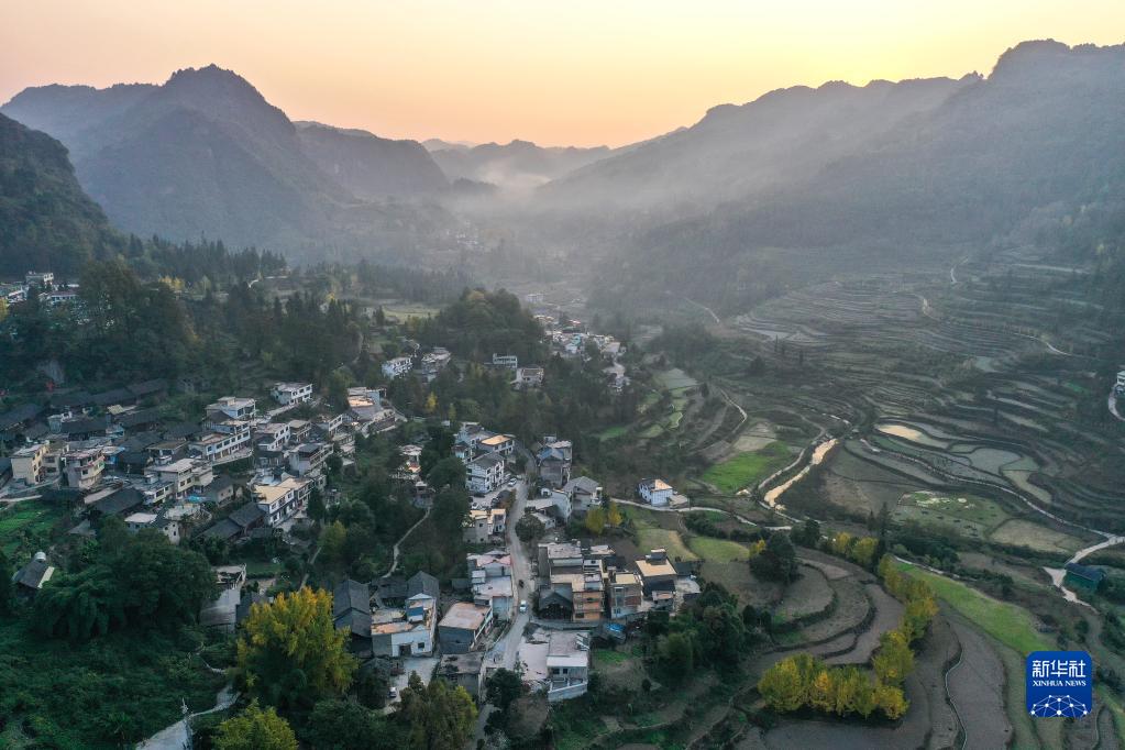 11月6日拍攝的貴州省貴陽(yáng)市烏當區羊昌鎮黃連村的古銀杏與村莊(無(wú)人機照片)。