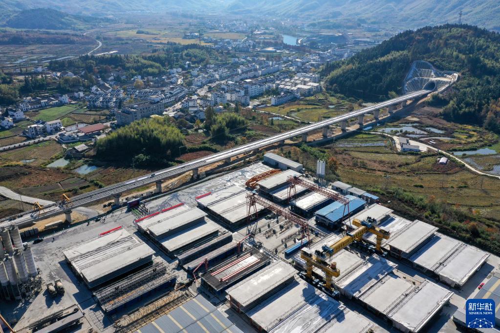 11月7日,中國鐵建大橋局池黃鐵路黃山制梁場(chǎng)施工人員在最后一榀箱梁澆筑現場(chǎng)施工(無(wú)人機照片)。