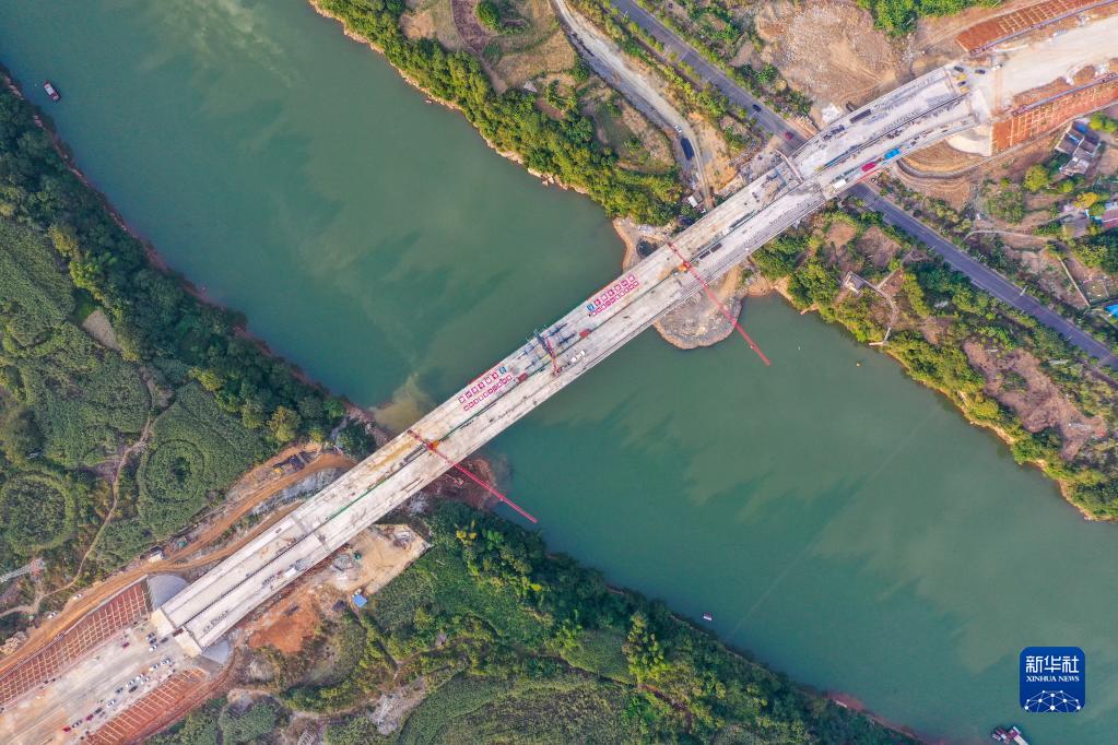 11月7日拍攝的建設中的廣西崇左麗江大橋(無(wú)人機照片)。