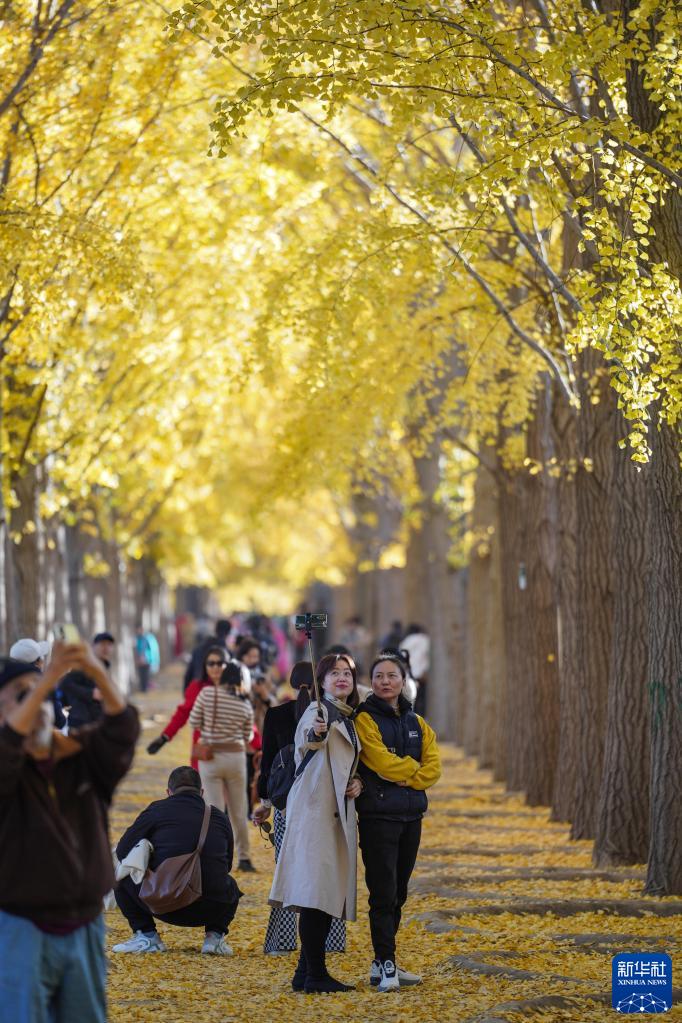 11月7日,游人在北京釣魚(yú)臺國賓館旁的銀杏大道上拍照留念。