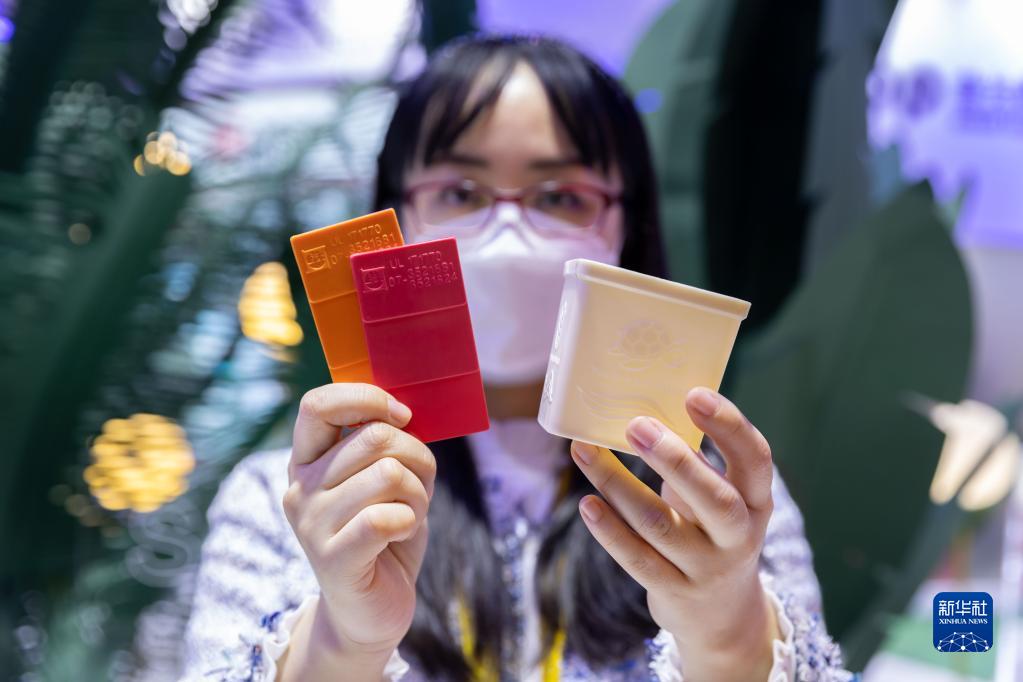 11月7日,工作人員在第五屆進(jìn)博會(huì )上展示創(chuàng )新纖維素生物基材“BBC纖維絮紙”。