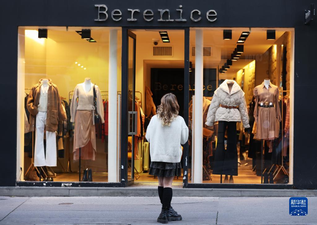 11月7日,一名女子望著(zhù)法國巴黎一家服裝店櫥窗里的新品服裝。