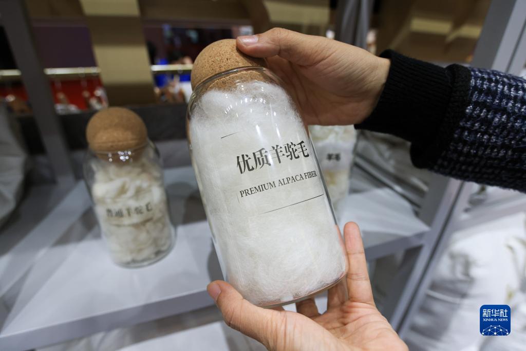 11月7日,在第五屆進(jìn)博會(huì )上,新西蘭太平洋羊駝集團公司工作人員在展臺介紹優(yōu)質(zhì)羊駝毛。