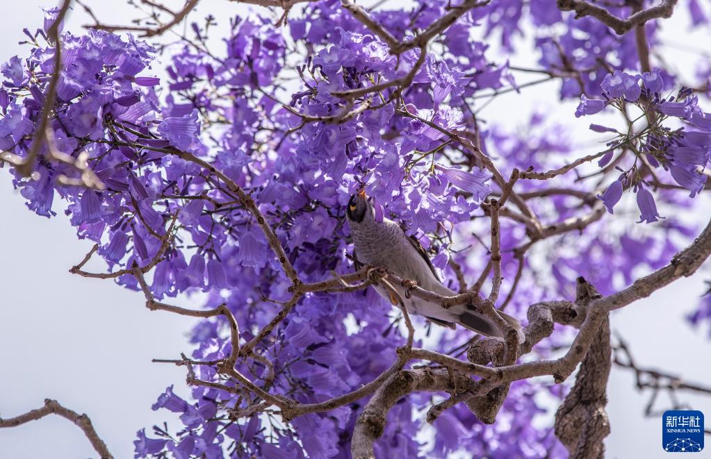 11月8日,在澳大利亞悉尼,一只黑頭礦鳥(niǎo)停在藍花楹樹(shù)上。