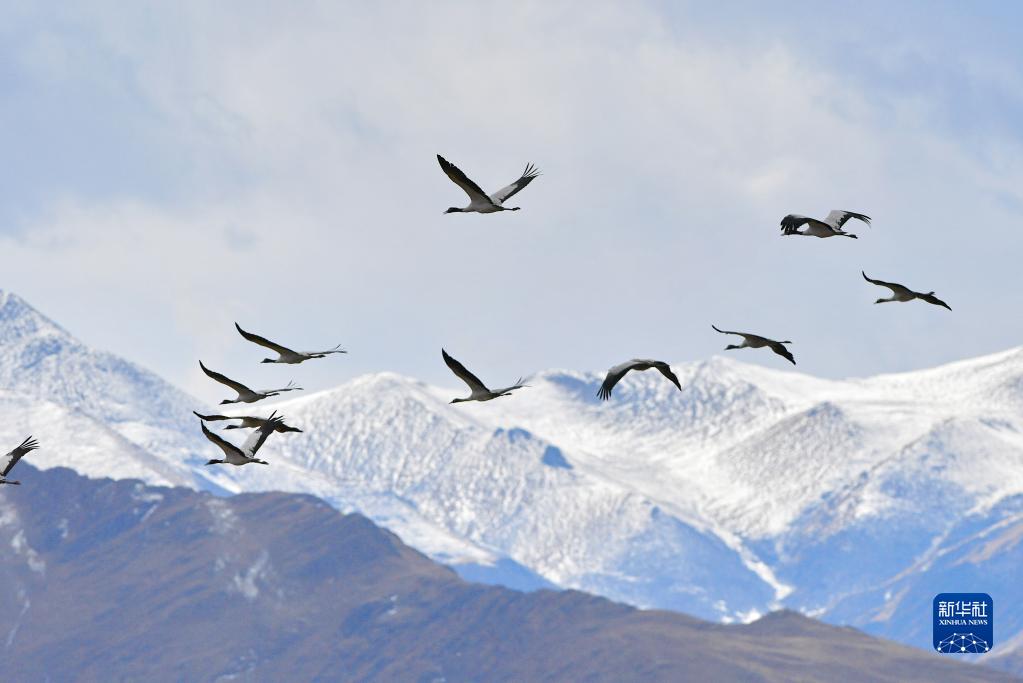 黑頸鶴在林周縣山巒間盤(pán)旋(11月6日攝)。