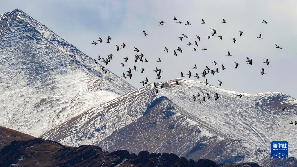 黑頸鶴群飛過(guò)林周縣強嘎鄉境內山梁(11月6日攝)。