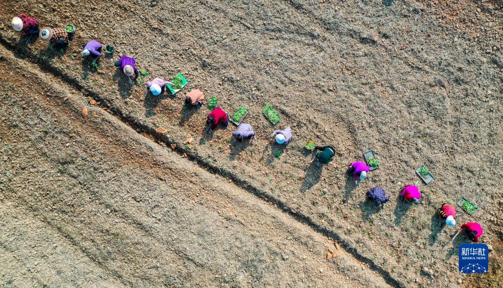 11月8日,在貴州省銅仁市玉屏侗族自治縣新店鎮沙水坪村,村民在高標準農田里種植油菜(無(wú)人機照片)。
