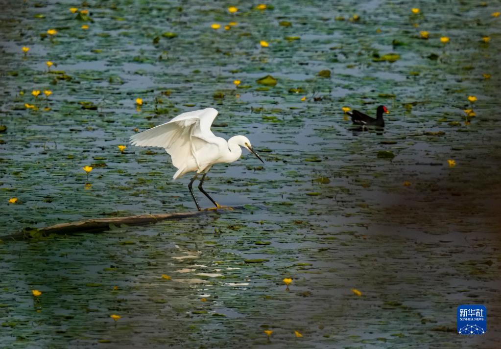 11月7日,在重慶市梁平區雙桂湖國家濕地公園,一只白鷺在湖畔的濕地振翅欲飛。