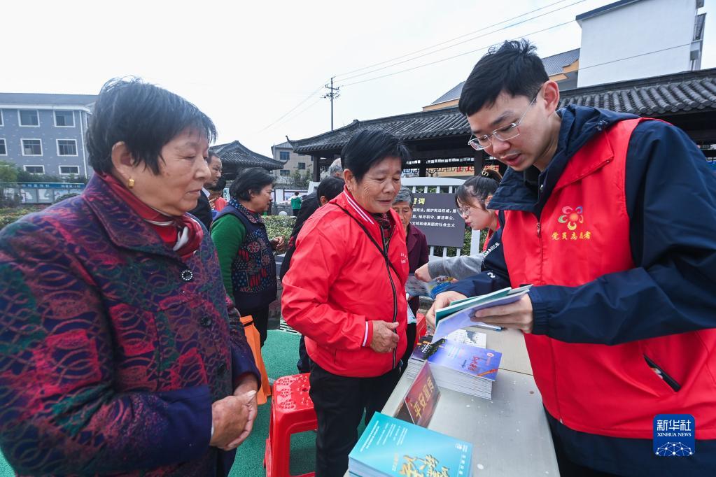 11月9日,在杭州市臨安區太陽(yáng)鎮上太陽(yáng)村,黨員志愿者向群眾發(fā)放法律相關(guān)宣傳資料。