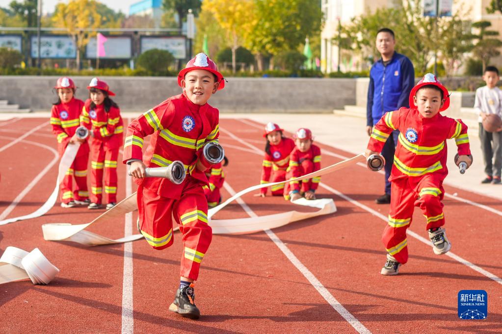 11月9日,在浙江省長(cháng)興縣煤山鎮中心小學(xué),學(xué)生在體驗消防員體能訓練。