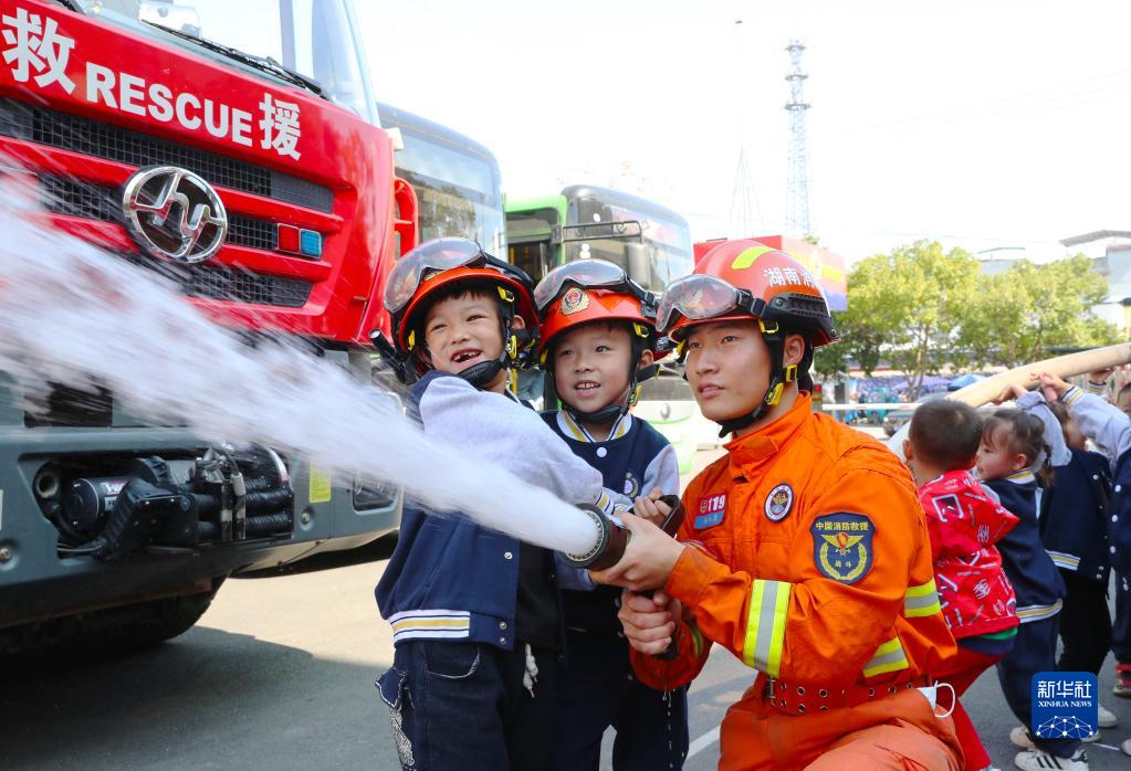 11月9日,在湖南省新田縣,小朋友在消防員的指導下體驗消防水槍。