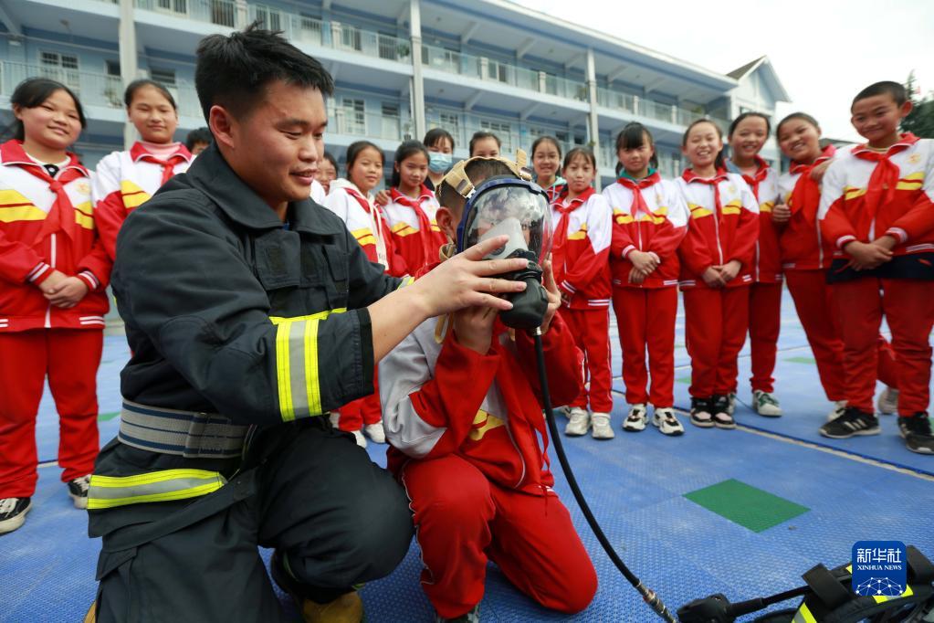 11月9日,在貴州甕安六小,學(xué)生在消防員的指導下體驗佩戴防毒面罩。