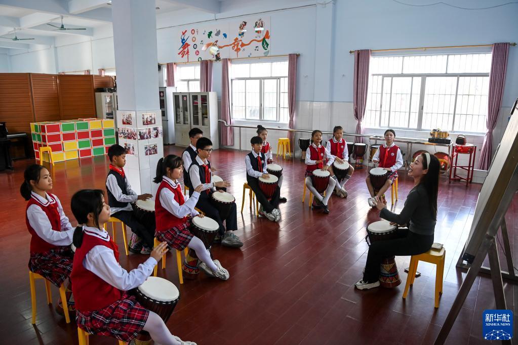 11月9日,在廣西興業(yè)縣石南鎮至德小學(xué),學(xué)生們在學(xué)習非洲鼓。
