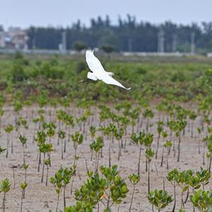 近期,在海南省儋州市新英鹽場(chǎng)濕地,連片人工栽種的紅樹(shù)林長(cháng)勢喜人,不少水鳥(niǎo)在此飛行、覓食。近年來(lái),為改善生態(tài)環(huán)境,保護鳥(niǎo)類(lèi)棲息地,當地開(kāi)展了新英鹽場(chǎng)紅樹(shù)林恢復造林工程,通過(guò)人工栽種紅樹(shù)林,讓原本用于養殖的灘涂變?yōu)榫G洲,吸引了不少水鳥(niǎo)、蟹類(lèi)等生物在此棲息,濕地生物多樣性日益豐富。