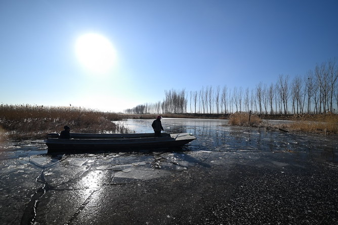 ??? 冬天的白洋淀鉛華盡洗。澄澈蔚藍的天空,結冰的湖面,巡航的破冰船,共同演繹這破碎的0°C美景。