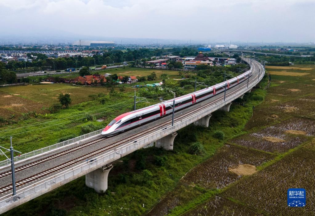 11月9日,在印度尼西亞西爪哇省萬(wàn)隆市,一列高鐵動(dòng)車(chē)組正在雅萬(wàn)高鐵試驗段進(jìn)行熱滑試驗(無(wú)人機照片)。