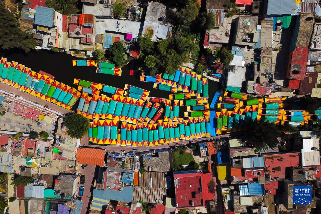 在墨西哥首都墨西哥城霍奇米爾科,游船停泊在運河內(航拍照片,2020年10月23日攝)。