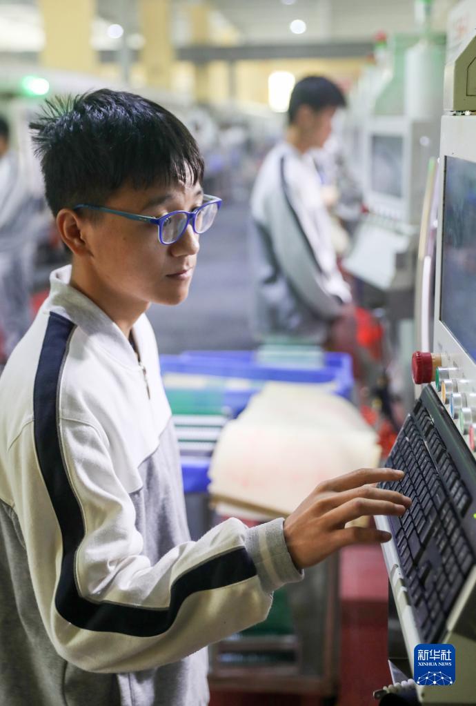 11月9日,華鎣市職業(yè)教育培訓中心的學(xué)生在設于一家電子產(chǎn)品企業(yè)車(chē)間的課堂上學(xué)習生產(chǎn)設備實(shí)操技術(shù)。