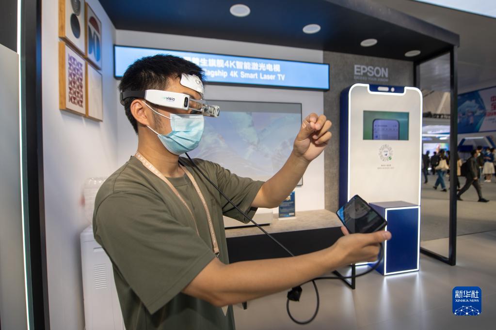 11月10日,觀(guān)眾在愛(ài)普生公司展臺體驗AR感知交互眼鏡系統。