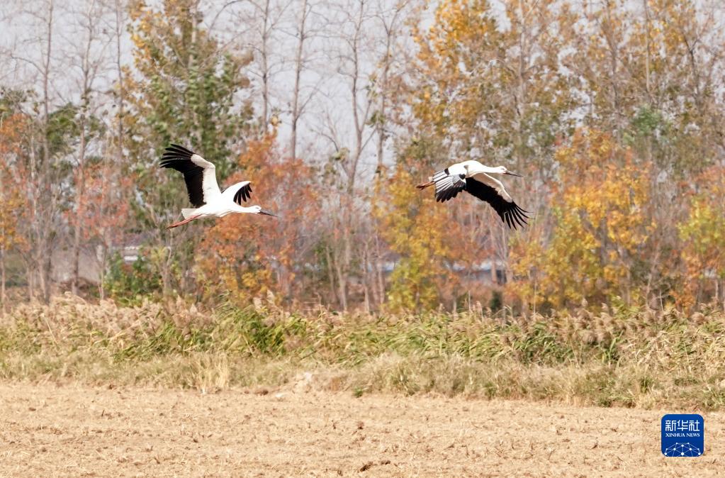 兩只東方白鸛飛翔在鹽城濕地珍禽國家級自然保護區附近的村莊(11月8日攝)。