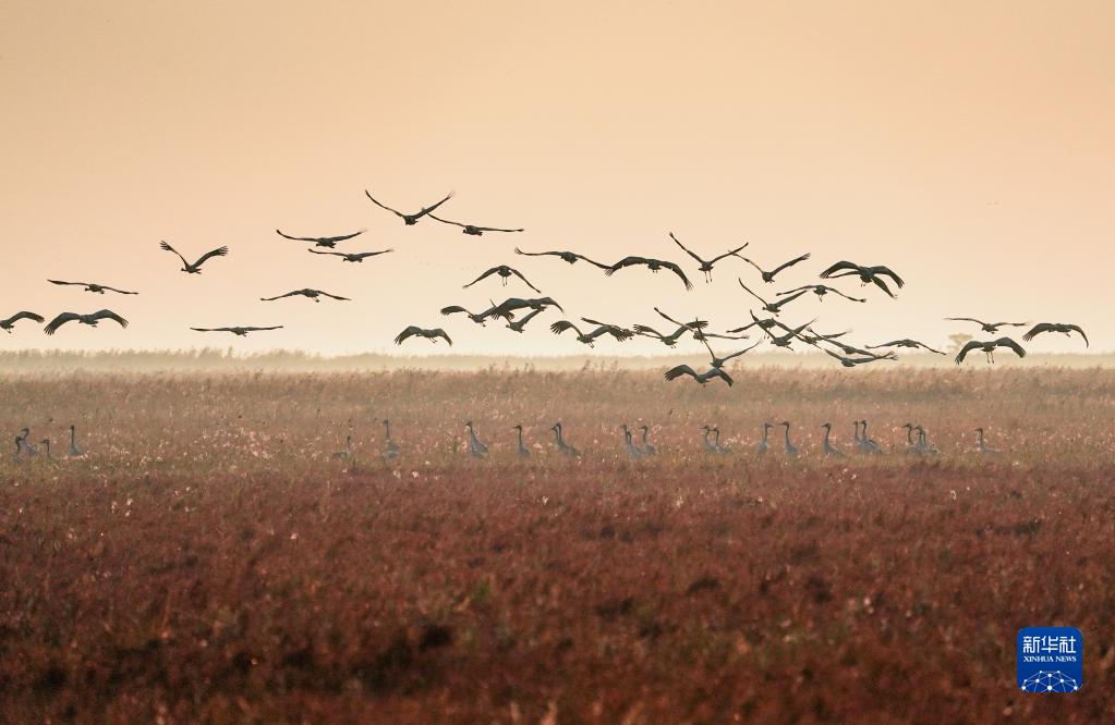 一群灰鶴在鹽城濕地珍禽國家級自然保護區飛翔(11月8日攝)。