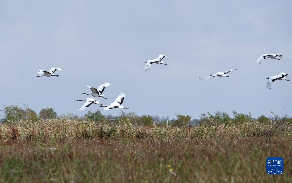 幾只馴養在鹽城濕地珍禽國家級自然保護區救護繁育中心的丹頂鶴在放飛中(11月8日攝)。