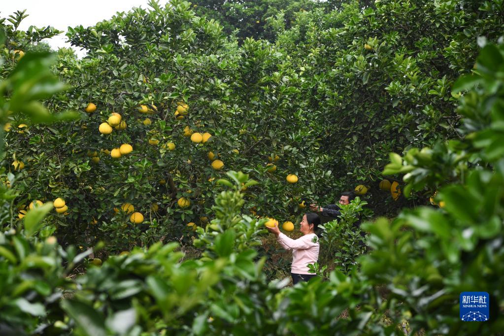 11月9日,在重慶市梁平區合興鎮龍灘村,村民在采摘柚子。