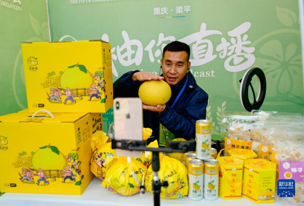 11月9日,在重慶市梁平區合興鎮龍灘村,工作人員在博覽會(huì )現場(chǎng)通過(guò)網(wǎng)絡(luò )平臺推介柚子產(chǎn)品。