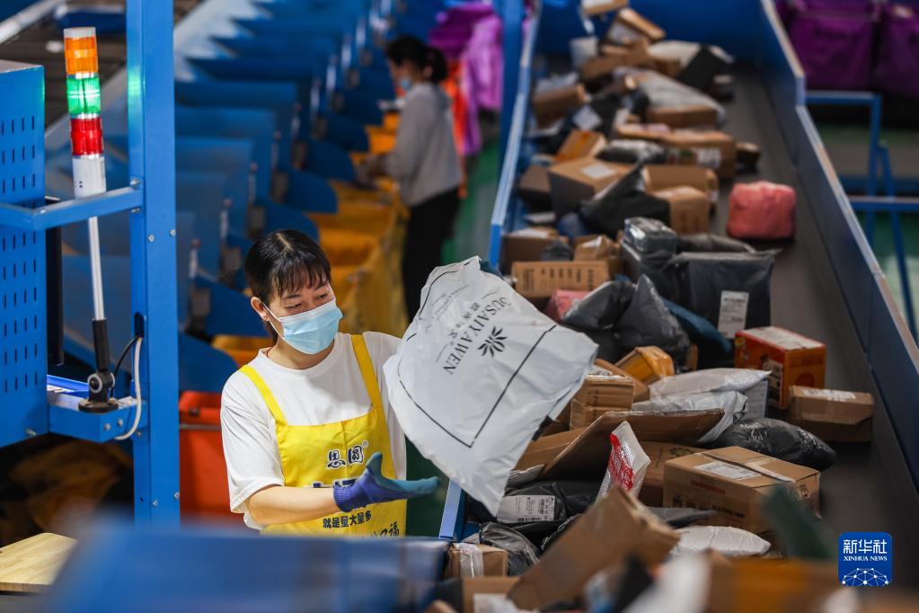 11月10日,在湖南省永州市藍山縣一家物流企業(yè),工作人員在分揀快遞。