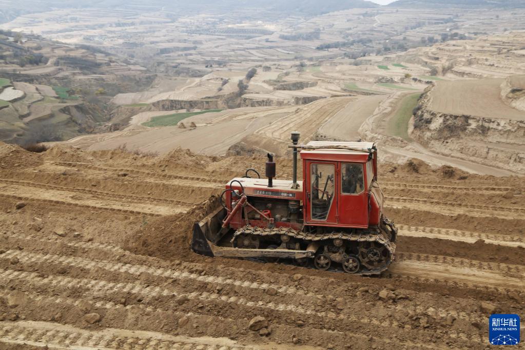 11月10日,施工機械在通渭縣什川鎮高標準農田建設現場(chǎng)作業(yè)。