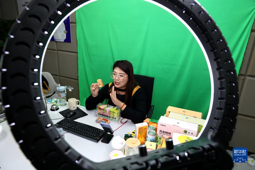 11月9日,網(wǎng)絡(luò )主播在山東省濱州市濱城區彭李街道數字經(jīng)濟產(chǎn)業(yè)園的直播間直播銷(xiāo)售商品。