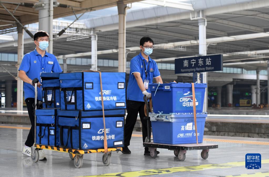 11月11日,中鐵快運南寧東站營(yíng)業(yè)部工作人員在南寧東站搬運快運件。