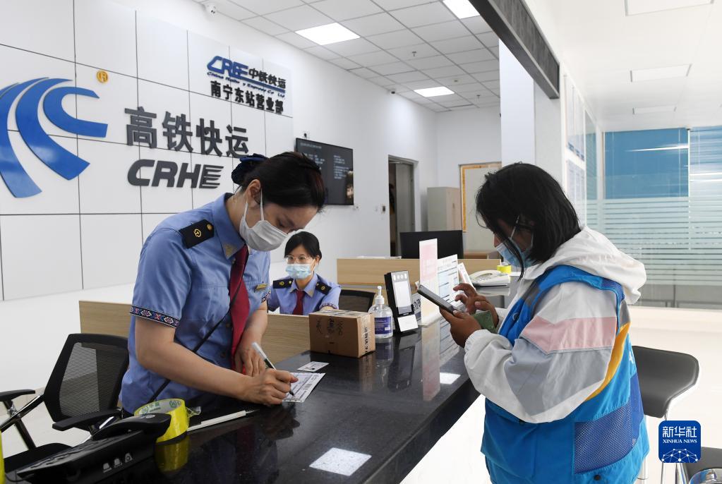 11月11日,在中鐵快運南寧東站營(yíng)業(yè)部,工作人員(左)在辦理快運業(yè)務(wù)。