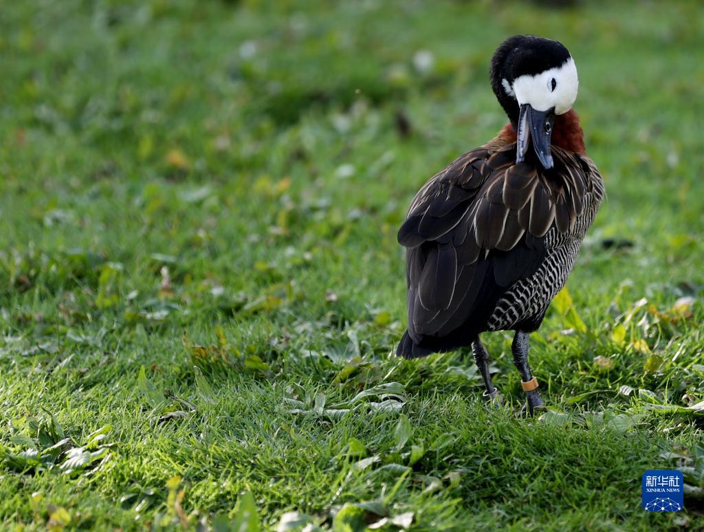 一只白臉樹(shù)鴨在英國倫敦濕地中心整理羽毛(11月9日攝)。