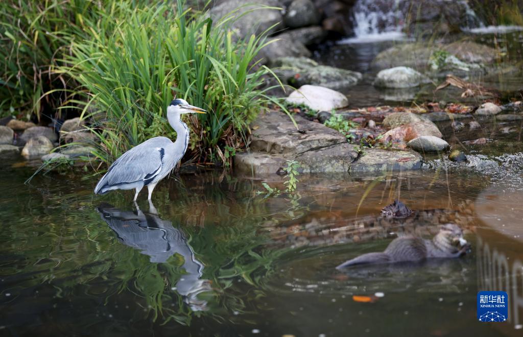 這是11月9日在英國倫敦濕地中心拍攝的蒼鷺和水獺。