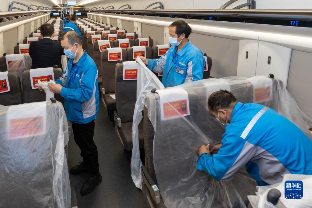 11月11日,在上海虹橋站,工作人員為列車(chē)座椅套上保護套。為應對 “雙11”物流高峰,中國鐵路上海局集團公司將部分載客高鐵動(dòng)車(chē)組列車(chē)用于快件運輸。