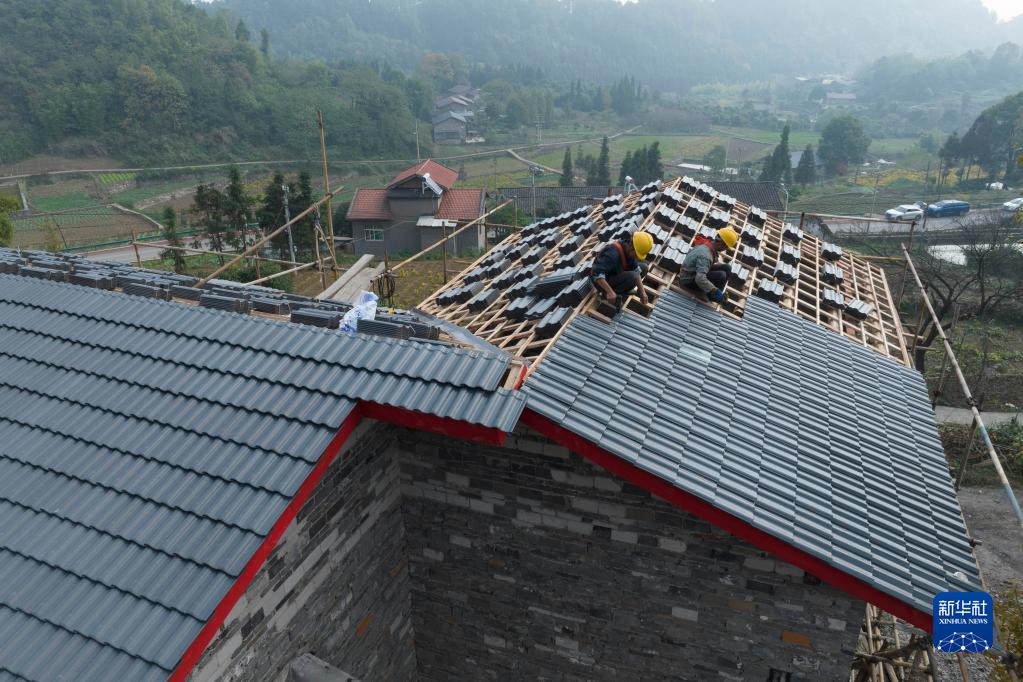 11月11日,在重慶市北碚天府鎮,施工人員在對農房進(jìn)行屋頂更換作業(yè)(無(wú)人機照片)。