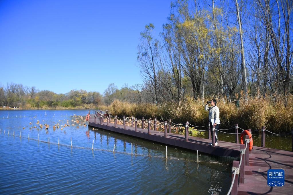 在翠湖國家城市濕地公園,張庚觀(guān)察候鳥(niǎo)棲息的情況(2022年11月7日攝)。