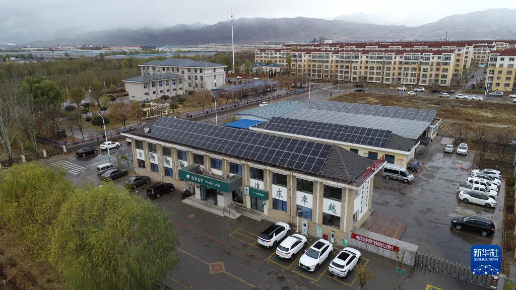 經(jīng)過(guò)“零碳化”改造后的國網(wǎng)寧夏電力石嘴山供電公司長(cháng)勝供電所全景(11月11日攝,無(wú)人機照片)。