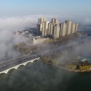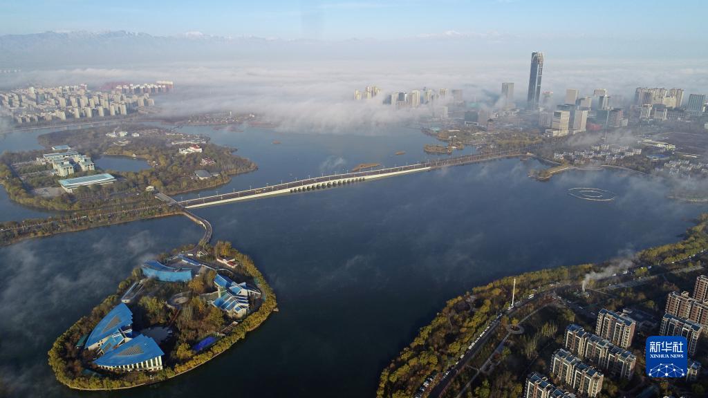 當日,“塞上湖城”寧夏銀川上空出現平流霧景觀(guān),宛若仙境。
